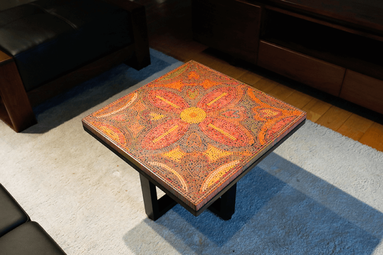 Mặt bàn trà được làm từ gỗ tự nhiên cùng hơn 7,000 mẩu bút chì màu tuyệt đẹp và nhựa epoxy cao cấp. Chân bàn sắt được sơn tĩnh điện bền bỉ với thời gian.
